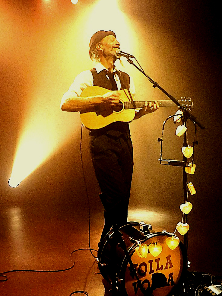 Après les Voilà Voilà en trio, voilà aujourd’hui le solo ! Et cette nouvelle proposition de l’âme du groupe est absolument emballante ! Car non seulement le bonhomme est un auteur-compositeur-chanteur de talent (ça on le savait !), mais ce dont on se doutait moins, c’est qu’il tiendrait la scène à lui tout seul avec une pêche, un engagement et une folie démultipliés ! Et ça fait sacrément plaisir à écouter et à voir ! Showman survolté et tendre, excellent musicien toujours proche de son public, il déroule ses airs bluesy, folk et funk qui invitent à mordre la vie à pleines dents.