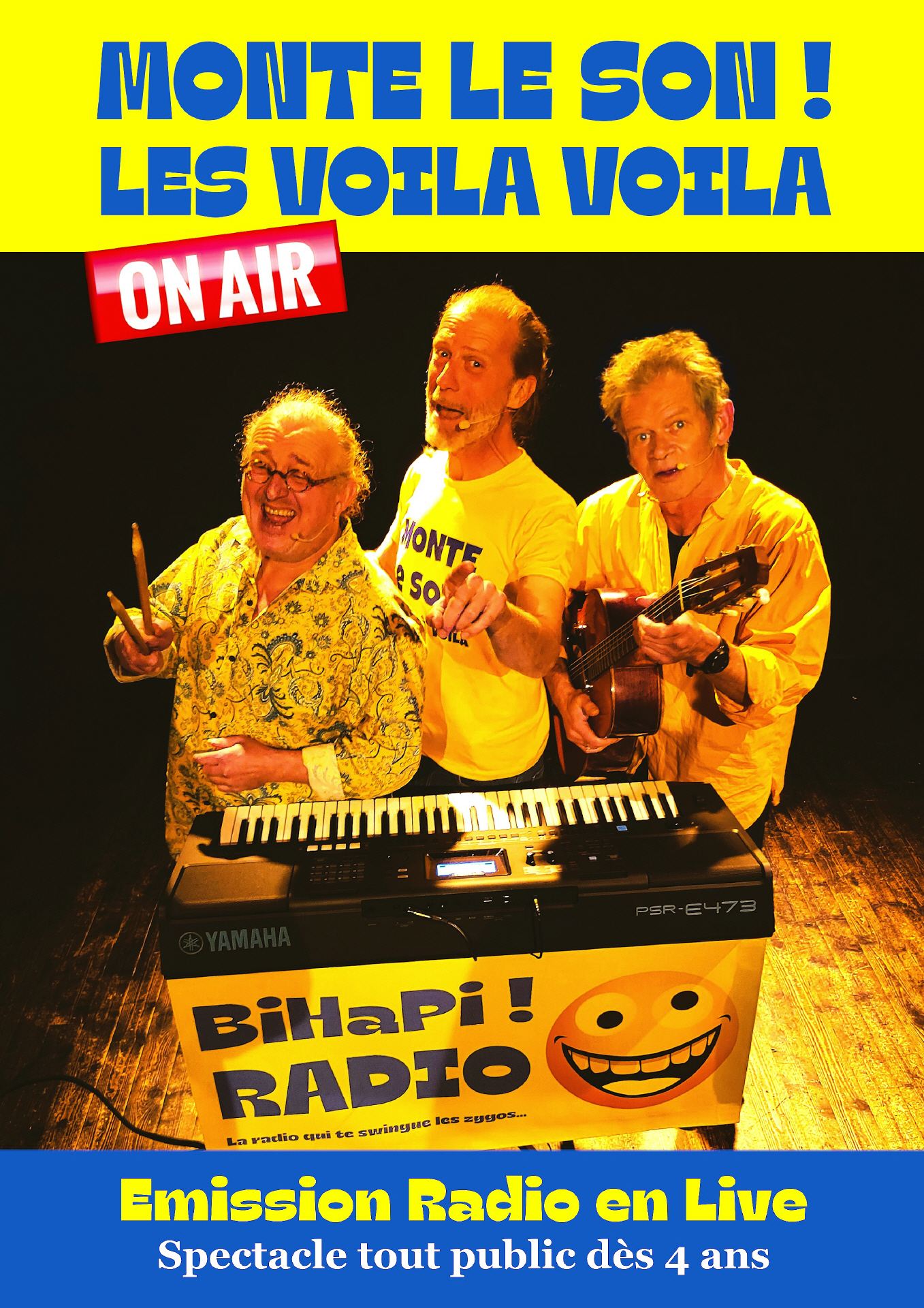 Après 20 ans de tournée, LES VOILA VOILA font peau neuve et vous embarquent pour une folle émission radio en direct et en public « MONTE LE SON » avec tout ce qu'il faut pour faire vivre aux enfants et parents l'expérience d'un show vraiment insolite sur les ondes de BIHAPI RADIO. Un jingle exaltant, des génériques à gogo, de drôles de rubriques, le temps des pourquois (sur le répondeur), le fameux grand jeu « Qui veut gagner des chaussons ? », la minute zen, la minute sport et le plein de tubes internationaux réécrits en français avec cette plume qu'on leur connaît, le tout réarrangé à la sauce électro swing !